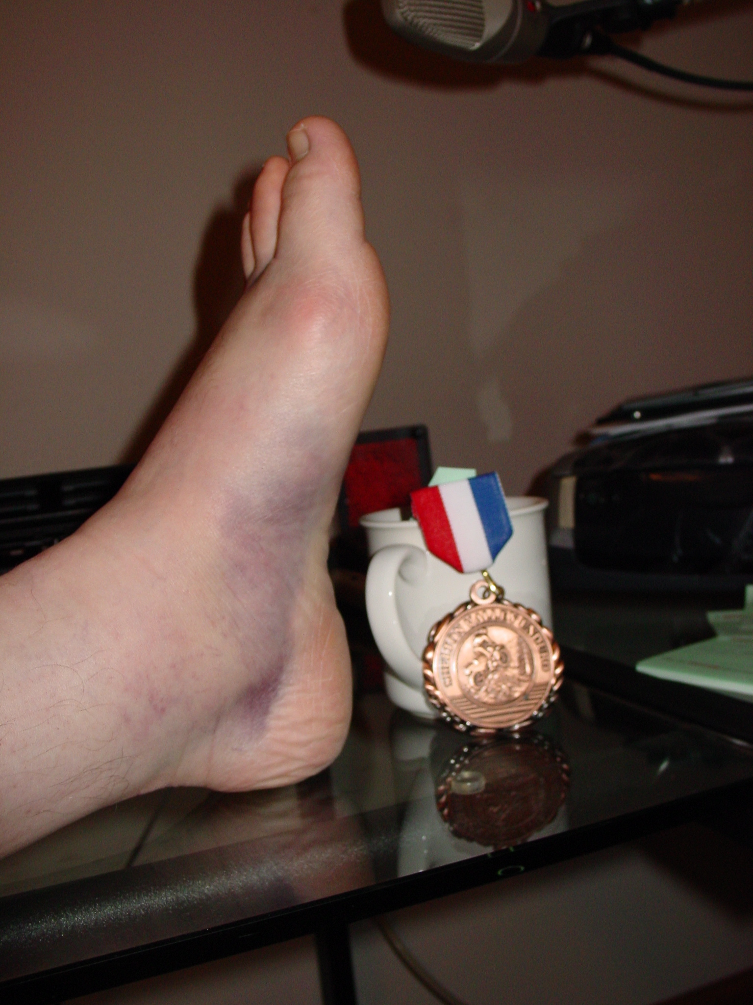 Now, here I sit with this stupid little bronze medal and a foot that’s rapidly swelling into one serious cankle (Ref Family Guy and Bill Clinton). I gotta go to work now!