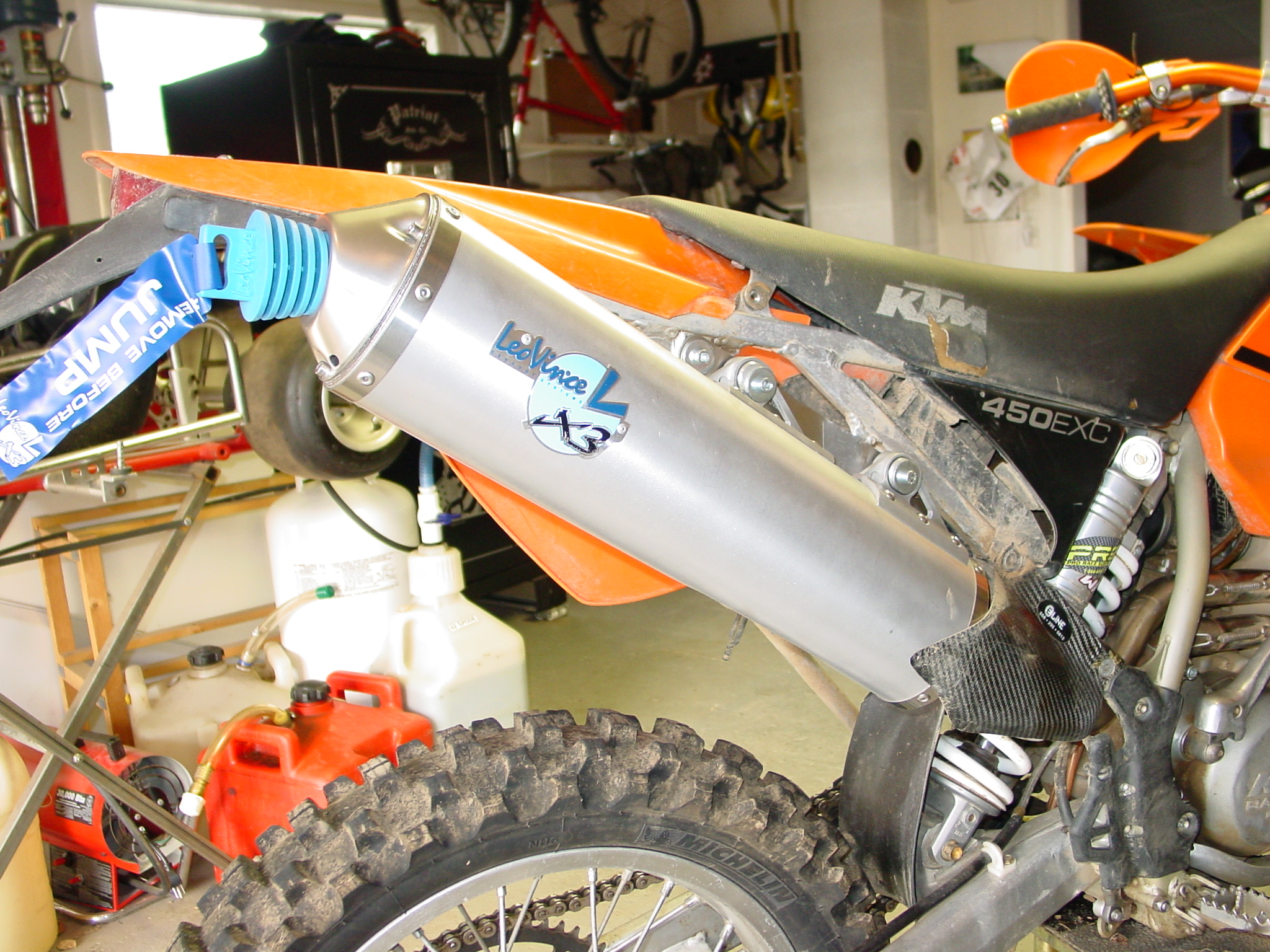pipe many months ago. But FMF never had the guts to call me to tell me they never planned on manufacturing the thing (I guess my model year is unique). I finally cancelled the order when I found an amazing deal on eBay. Seems a company in California got a deal on the closeout stock of another shop. THis included a $900 Leo Vince KTM exhaust system for my year of motorcycle! And they only wanted $200 for it! This is a seriously nice exhaust. All stainless steel. Perfectly fitted. And pretty darn quiet to boot. I guess I have to consider myself lucky